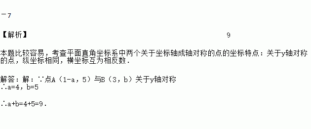 点A( 1-a, 5 ),B( 3 , b )关于y轴对称,则a+b= 。