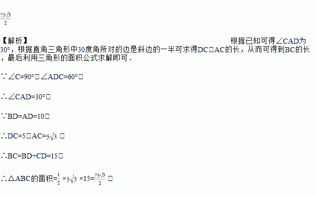 在Rt△ABC中,∠C=90°,D是BC边上一点,且BD=AD=10,∠ADC=60°,求△ABC的面积.