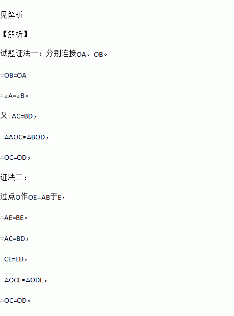 如图,AB是⊙O的弦(非直径),C、D是AB上的两点,并且AC=BD。求证:OC=OD。