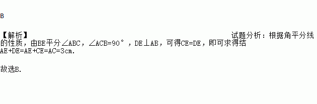 如图,在△ABC中,∠ACB=90°,BE平分∠ABC,DE⊥AB于D,如果AC=3cm,那么AE+DE等于( )