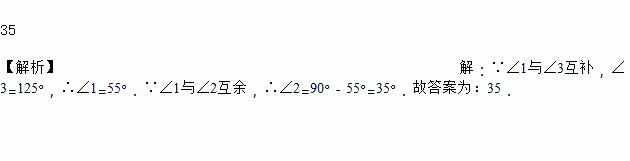 ∠1与∠2互余,∠1与∠3互补,若∠3=125°,则∠2= ________度。