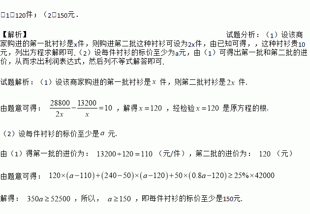 (1)120件;(2)150元. 【解析】试题分析:(1)设该商家购进的第一批衬衫是x件,则购进第二批这种衬衫可设为2x件,由已知可得,,这种衬衫贵10元,列出方程求解即可.(2)设每件衬衫的标价至少为a元,由(1)可得出第一批和第二批的进价,从而求出利润表达式,然后列不等式解答即可. 试题解析:(1)设该商家购进的第一批衬衫是件,则第二批衬衫是件. 由题意可得: ,解得,经检验...