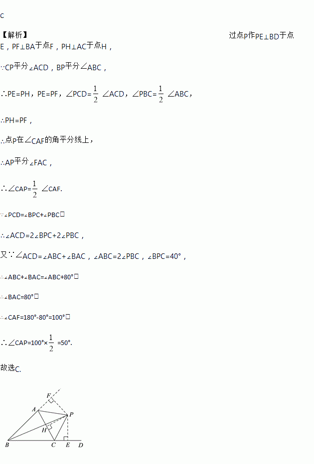 如图,△ABC的外角∠ACD的平分线CP与∠ABC平分线BP交于点P,若∠BPC=40°,则∠CAP的度数是( )