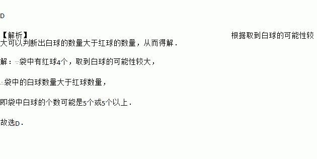 袋中有红球4个,白球若干个,它们只有颜色上的区别,从袋中随机地取出一个球,如果取得白球的可能性较大,那么袋中白球可能有( )