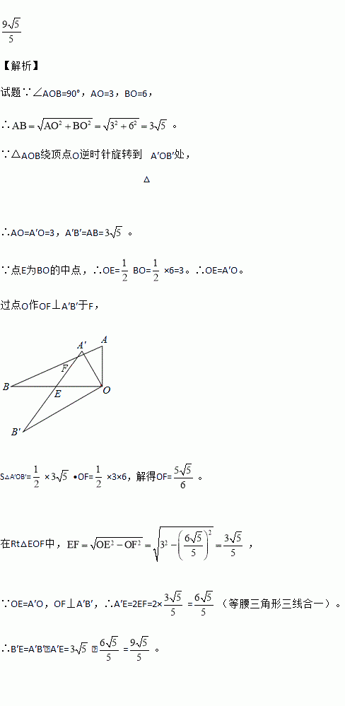 如图,△AOB中,∠AOB=90°,AO=3,BO=6,△AOB绕顶点O逆时针旋转到△A′OB′处,此时线段A′B′与BO的交点E为BO的中点,则线段B′E的长度为 .
