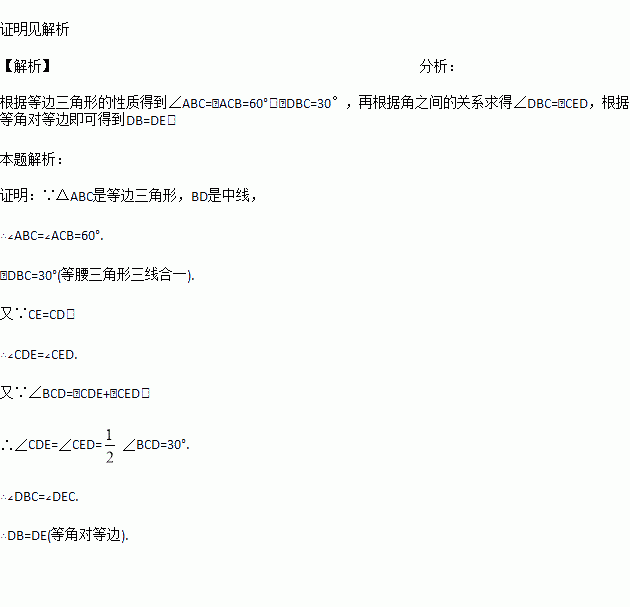 如图,△ABC是等边三角形,BD平分∠ABC,延长BC到E,使得CE=CD.