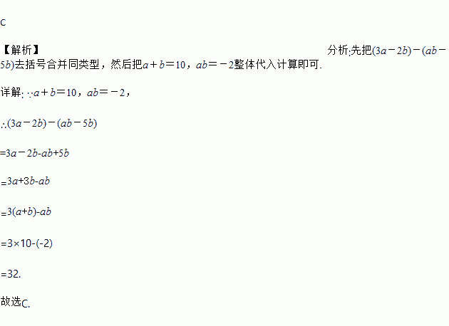 已知a+b=10,ab=-2,则(3a-2b)-(ab-5b)的值为( )