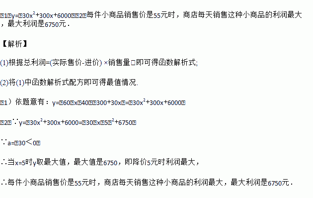 某商店经营一种小商品,进价是每件40元.据市场调查,销售价是60元时,平均每星期的销售量是300件.而销售价每降价1元,平均每星期的期就多售出30件.