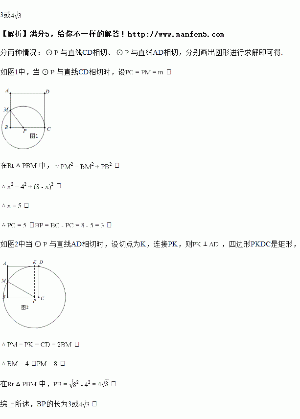如图,正方形ABCD的边长为8,M是AB的中点,P是BC边上的动点,连结PM,以点P为圆心,PM长为半径作当与正方形ABCD的边相切时,BP的长为______.