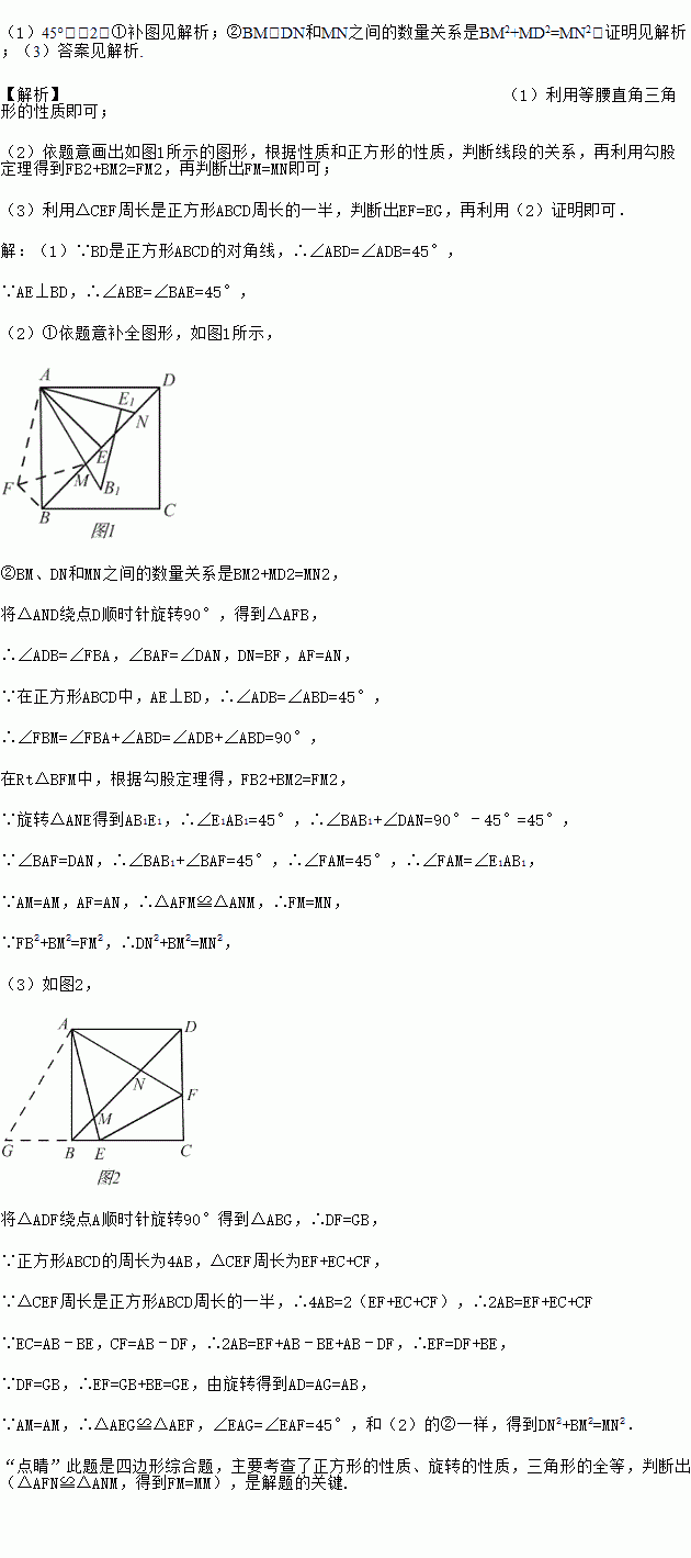 (3)如图2,E、F是边BC、CD上的点,△CEF周长是正方形ABCD周长的一半,AE、AF分别与BD交于M、N,写出判断线段BM、DN、MN之间数量关系的思路.(不必写出完整推理过程)