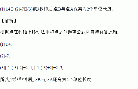 (3)若(1)中点B以每秒2个单位长度沿数轴向左运动,A不动,多长时间后,点B与点A距离为2个单位长度?试列式计算.