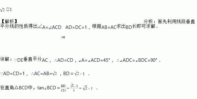 如图,△ABC中,AB=AC,∠A=45°,AC的垂直平分线分别交AB,AC于D,E两点,连接CD.如果AD=1,那么tan∠BCD=_____.