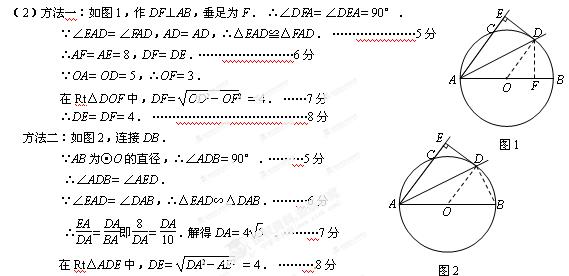(2)若AE=8,⊙O的半径为5,求DE的长.