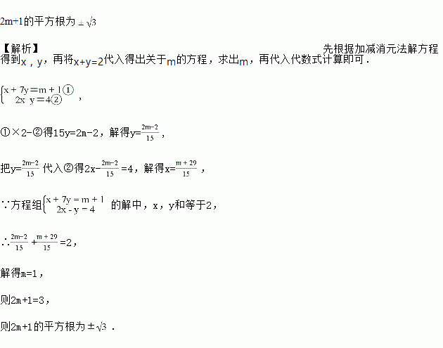 在方程组的解中,x、y和等于2,求代数式2m+1的平方根.