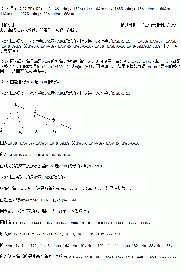 根据以上内容猜想:若经过n次折叠∠BAC是△ABC的好角,则∠B与∠C(不妨设∠B>∠C)之间的等量关系为 .