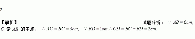 如图,点C是线段AB的中点,AB=6cm,如果点D是线段AB上一点,且BD =1cm,那么CD =_________cm.