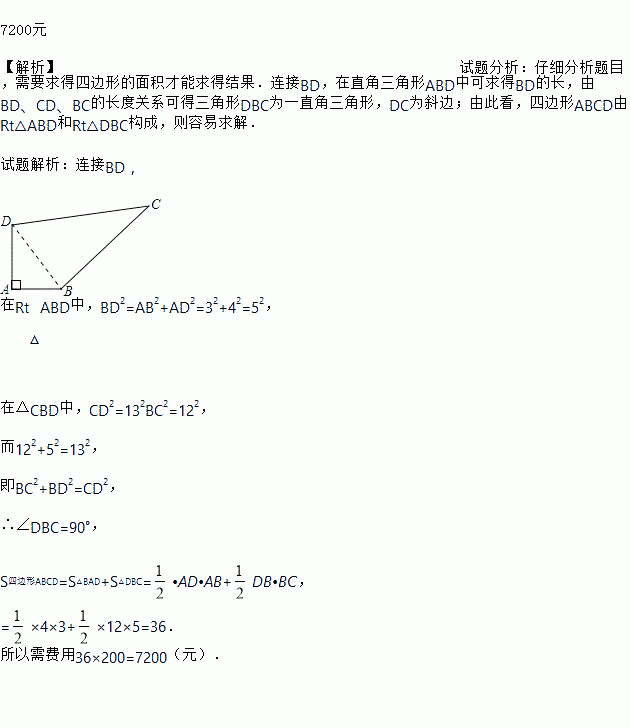 已知某开发区有一块四边形的空地ABCD,如图所示,现计划在空地上种植草皮,经测量∠A=90°,AB=3m,BC=12m,CD=13m,DA=4m,若每平方米草皮需要200元,问要多少投入?