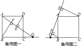 (2)当点G在BC延长线上时(备用图一),作出对应图形,问:线段AF、BF、EF之间有什么关系(只写结论,不要求证明)?