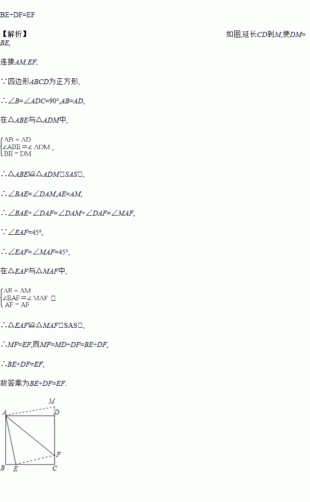 如图,自正方形ABCD的顶点A引两条射线分别交BC、CD于E、F,∠EAF=45°,在保持∠EAF=45°的前提下,当点E、F分别在边BC、CD上移动时,BE+DF与EF的关系是______.