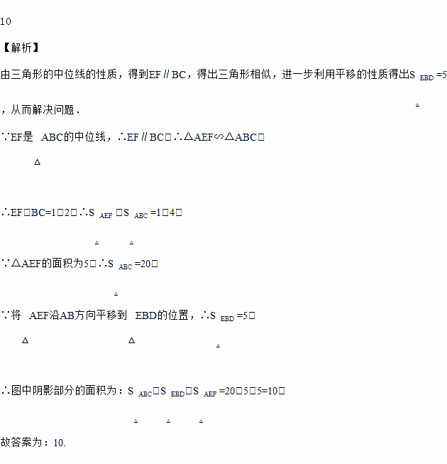 如图,EF是△ABC的中位线,将△AEF沿AB方向平移到△EBO的位置,点D在BC上,已知△AEF的面积为5,则图中阴影部分的面积为________.
