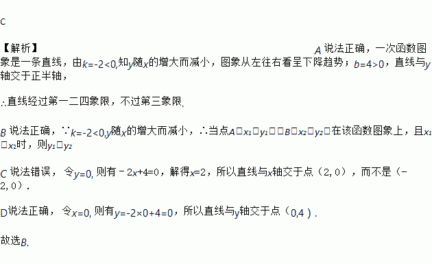 对于一次函数y=﹣2x+4,下列结论错误的是( )