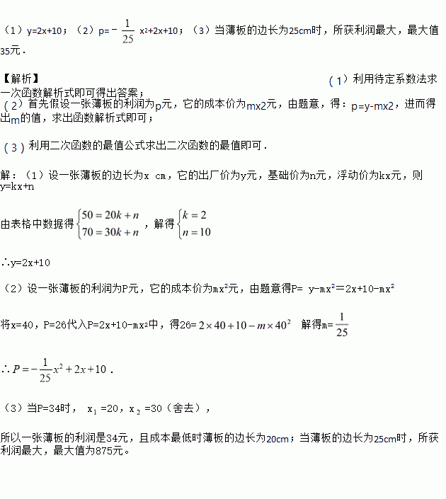 (1)y=2x+10;(2)p=﹣x2+2x+10;(3)当薄板的边长为25cm时,所获利润最大,最大值35元. 【解析】(1)利用待定系数法求一次函数解析式即可得出答案; (2)首先假设一张薄板的利润为p元,它的成本价为mx2元,由题意,得:p=y-mx2,进而得出m的值,求出函数解析式即可; (3)利用二次函数的最值公式求出二次函数的最值即可. 【解析】 (1)设一张薄板的边...
