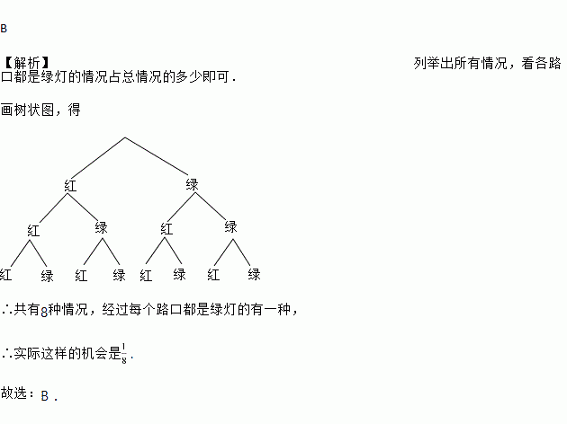 小红上学要经过三个十字路口,每个路口遇到红、绿灯的机会都相同,小红希望小学时经过每个路口都是绿灯,但实际这样的机会是( )