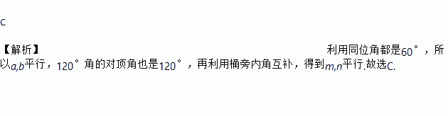 C 【解析】利用同位角都是60°,所以a,b平行,120°角的对顶角也是120°,再利用桶旁内角互补,得到m,n平行.故选C.