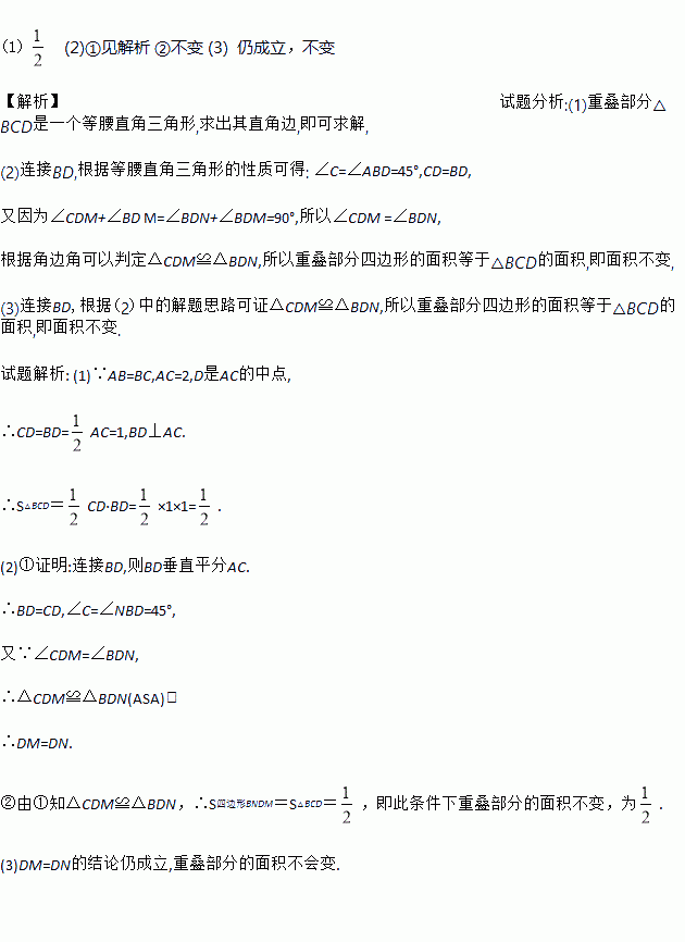 (3)如图3,将直角三角板DEF绕D点按顺时针方向旋转α度(0<α<90),DE交BC于点M,DF交AB于点N,则DM=DN的结论仍成立吗?重叠部分的面积会变吗?(请直接写出结论,不需要说明理由)