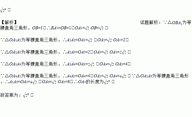 如图,已知OB=1,以OB为直角边作等腰直角三角形A1BO,再以OA1为直角边作等腰直角三角形A2A1O,如此下去,则线段OAn的长度为____.