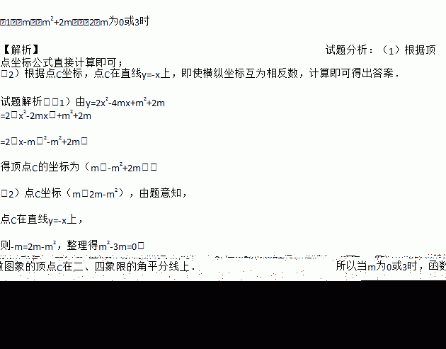 (1)(m,﹣m2+2m);(2)m为0或3时 【解析】试题分析:(1)根据顶点坐标公式直接计算即可; (2)根据点C坐标,点C在直线y=-x上,即使横纵坐标互为相反数,计算即可得出答案. 试题解析:(1)由y=2x2-4mx+m2+2m =2(x2-2mx)+m2+2m =2(x-m)2-m2+2m, 得顶点C的坐标为(m,-m2+2m); (2)点C坐标(m,2m-...