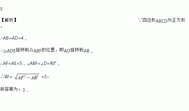 如图,有正方形ABCD,把△ADE顺时针旋转到△ABF的位置.其中AD=4,AE=5,则BF=_____.