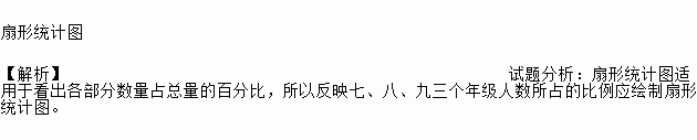 扇形统计图 【解析】试题分析:扇形统计图适用于看出各部分数量占总量的百分比,所以反映七、八、九三个年级人数所占的比例应绘制扇形统计图。