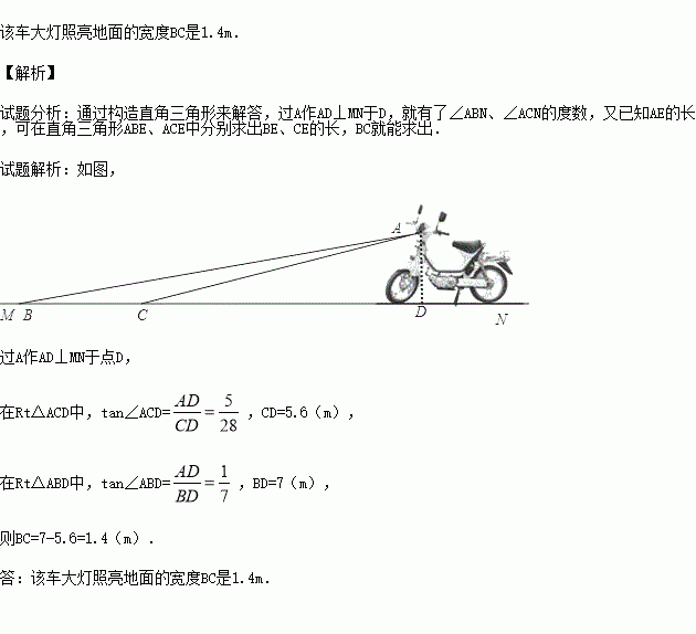 某厂家新开发的一种电动车如图,它的大灯A射出的光线AB,AC与地面MN所夹的锐角分别为8°和10°,大灯A与地面离地面的距离为1m求该车大灯照亮地面的宽度BC.(不考虑其它因素)(参数数据:sin8°=