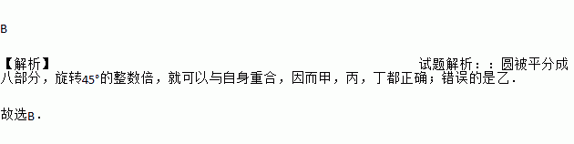 B 【解析】试题解析::圆被平分成八部分,旋转45°的整数倍,就可以与自身重合,因而甲,丙,丁都正确;错误的是乙. 故选B.