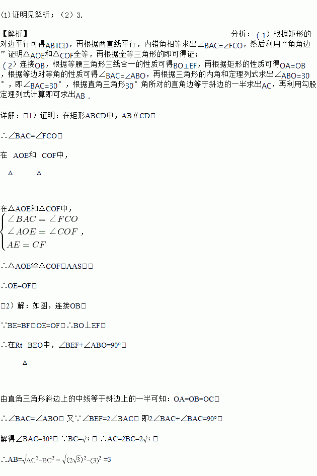 如图,在矩形ABCD中,E、F分别是边AB、CD上的点,AE=CF,连接EF、BF,EF与对角线AC交于点O,且BE=BF,∠BEF=2∠BAC。