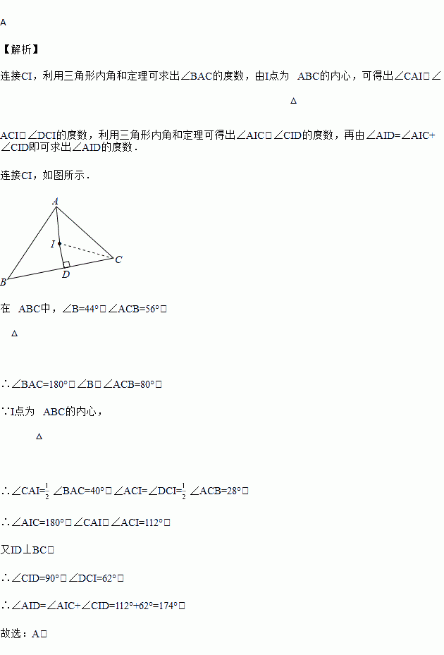 如图,I点为△ABC的内心,D点在BC上,且ID⊥BC,若∠B=44°,∠C=56°,则∠AID的度数为何?( )