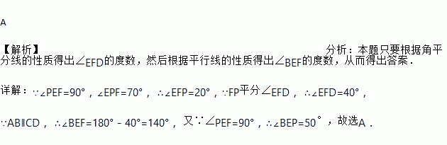 如图,AB∥CD,EF与AB、CD分别相交于点E、F,EP⊥EF,与∠EFD的平分线FP相交于点P,且∠EPF=70°,则∠BEP的度数为( )