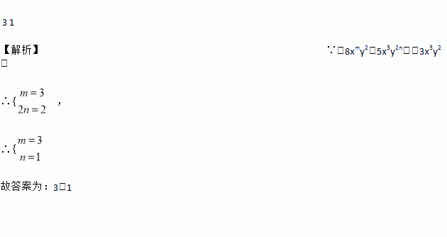 如果-8xmy2+5x3y2n=-3x3y2,则m=___ ,n=____.