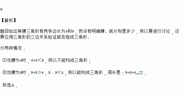 已知等腰三角形的一边长等于4,一边长等于9,则它的周长为( )