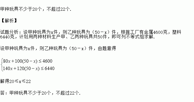 一玩具厂生产甲、乙两种玩具,已知造一个甲种玩具需用金属80克,塑料140克,造一个乙种玩具需用金属100克,塑料120克.若工厂有金属4600克,塑料6440克,计划用两种材料生产甲、乙两种玩具共50件,求甲种玩具件数的取值范围.