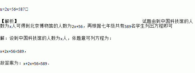 某校七年级共有587名学生分别到北京博物馆和中国科技馆参观,其中到北京博物馆的人数比到中国科技馆人数的2倍还多56人,设到中国科技馆的人数为x人,可列方程为_____.