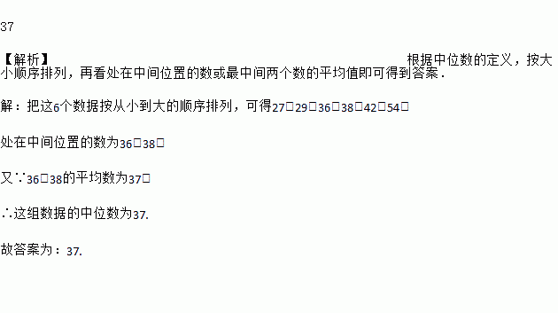 李老师最近6个月的手机话费(单位:元)分别为:27,36,54,29,38,42,这组数据的中位数是_____.