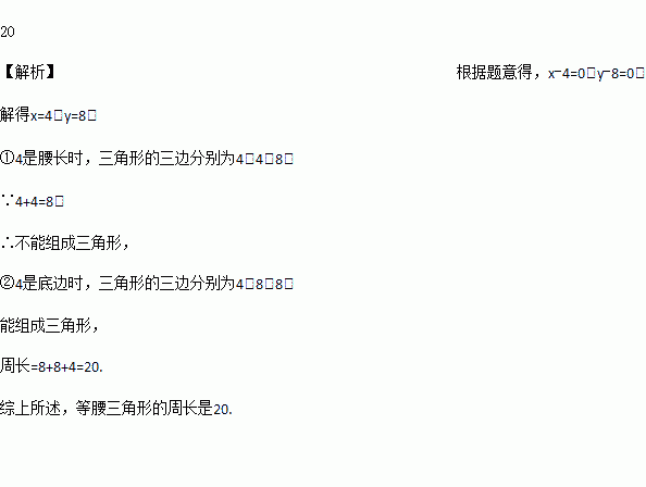 已知实数x,y满足,则以x,y的值为两边长的等腰三角形的周长是________.