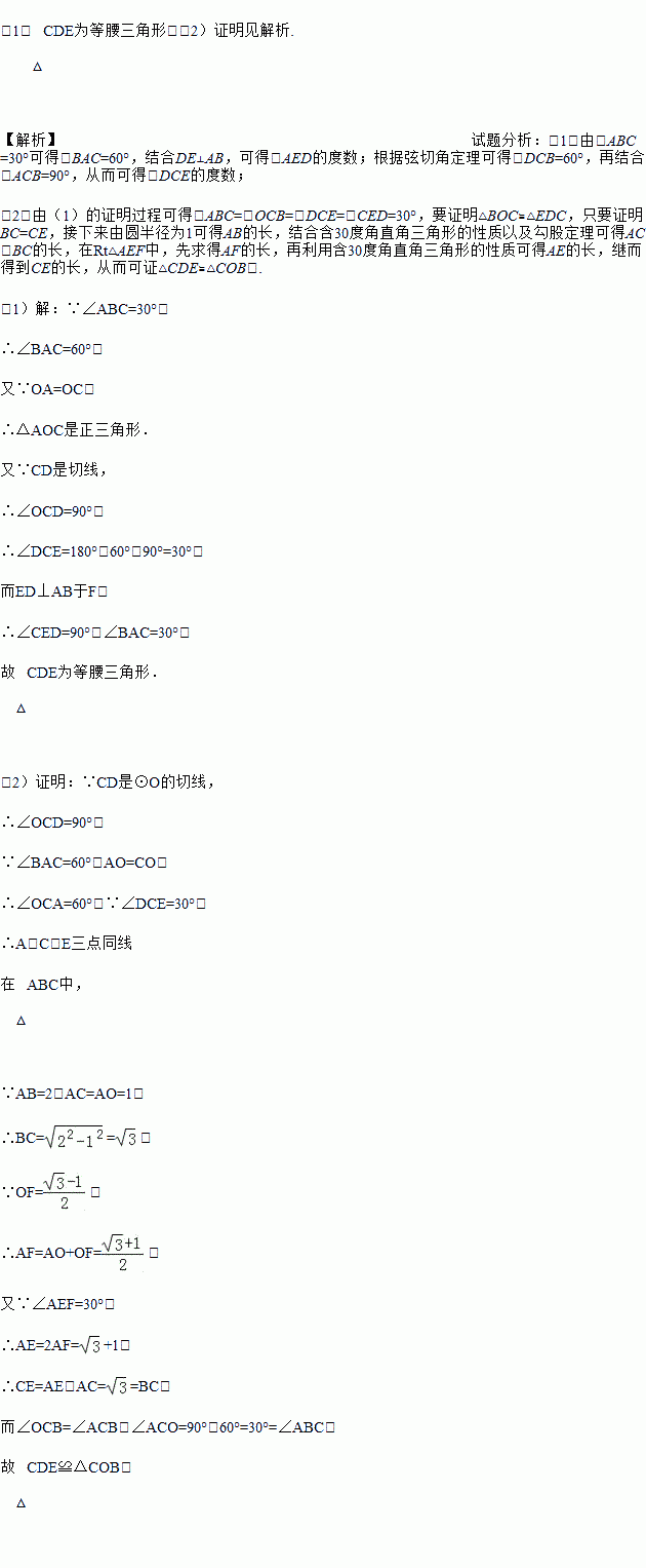 如图,⊙O是Rt△ABC的外接圆,AB为直径,∠ABC=30°,CD是⊙O的切线,E为AC延长线上一点,ED⊥AB于F.