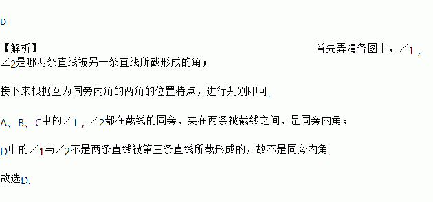 在下列图形中,∠1与∠2不是同旁内角的是( )