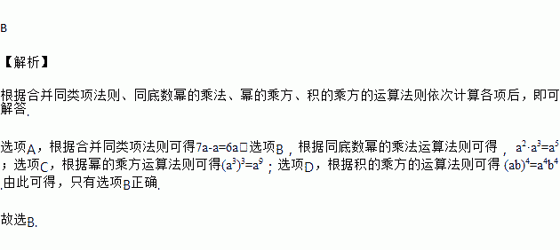 A. 7a-a=6 B. a2·a3=a5 C. (a3)3=a6 D. (ab)4=ab4