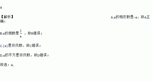 A 【解析】A.a的相反数是?a,故A正确; B.a的倒数是,故B错误; C.|a|是非负数,故C错误; D.a的平方是非负数,故D错误; 故选:A.