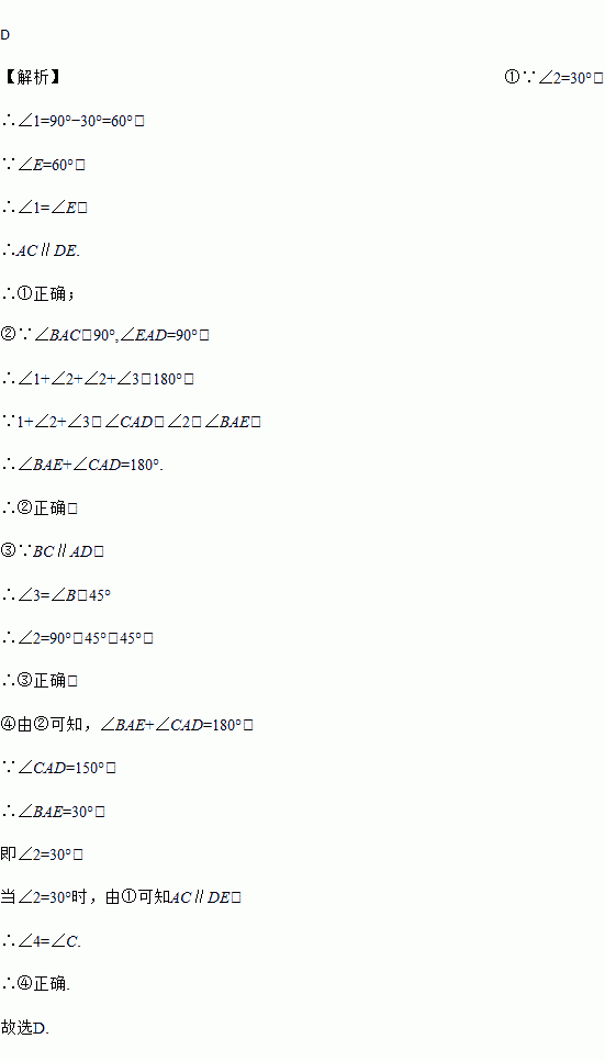 ④如果∠CAD=150°,必有∠4=∠C;
