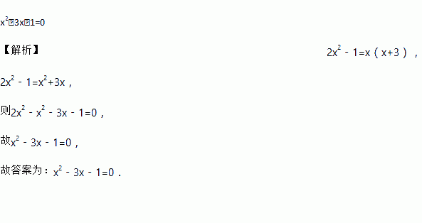 x2﹣3x﹣1=0 【解析】2x2﹣1=x(x+3), 2x2﹣1=x2+3x, 则2x2﹣x2﹣3x﹣1=0, 故x2﹣3x﹣1=0, 故答案为:x2﹣3x﹣1=0.
